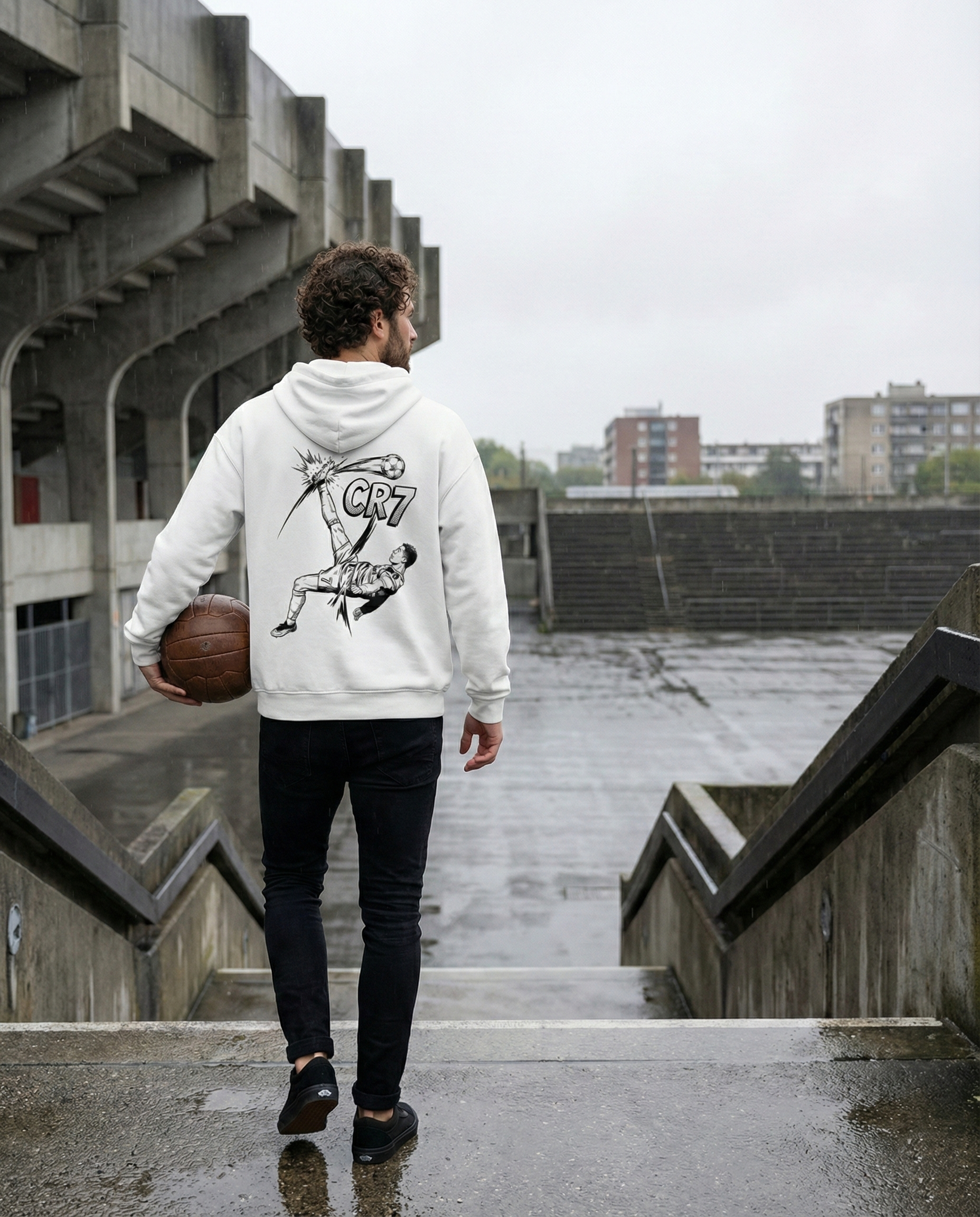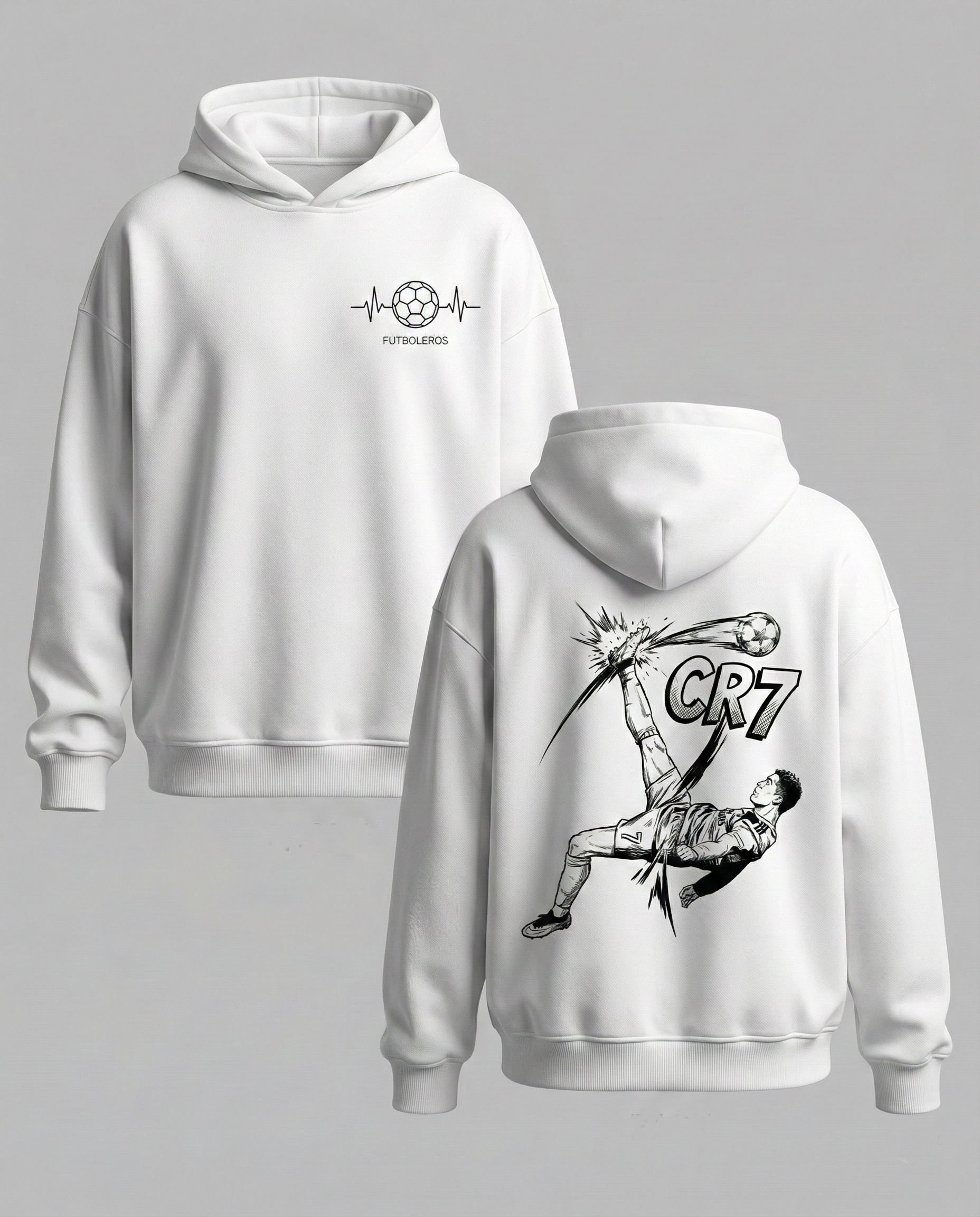 The Design This isn't just a photo; it’s dynamic art. The back of the hoodie features a high-energy, manga-style comic illustration of Ronaldo mid-flight, connecting perfectly with the ball. Explosive motion lines and bold "CR7" text emphasize the power of the moment.